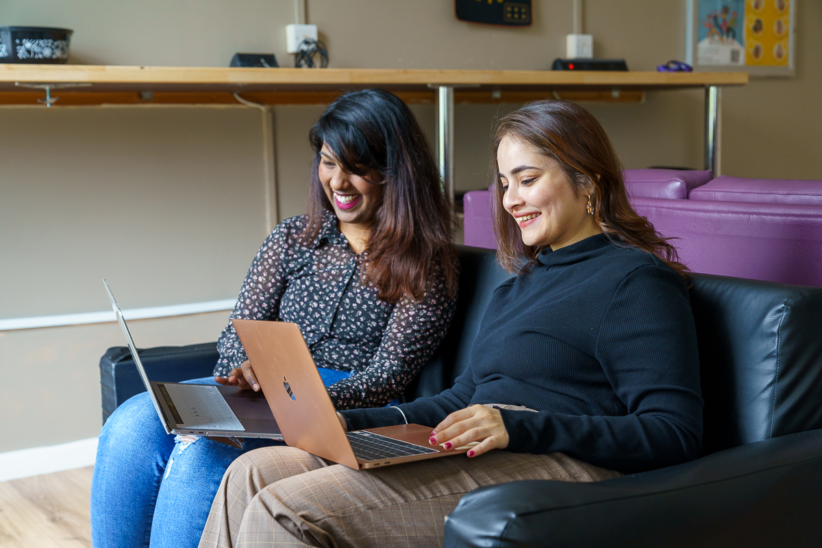 Two girls sitting on a sofa with there laptops open.