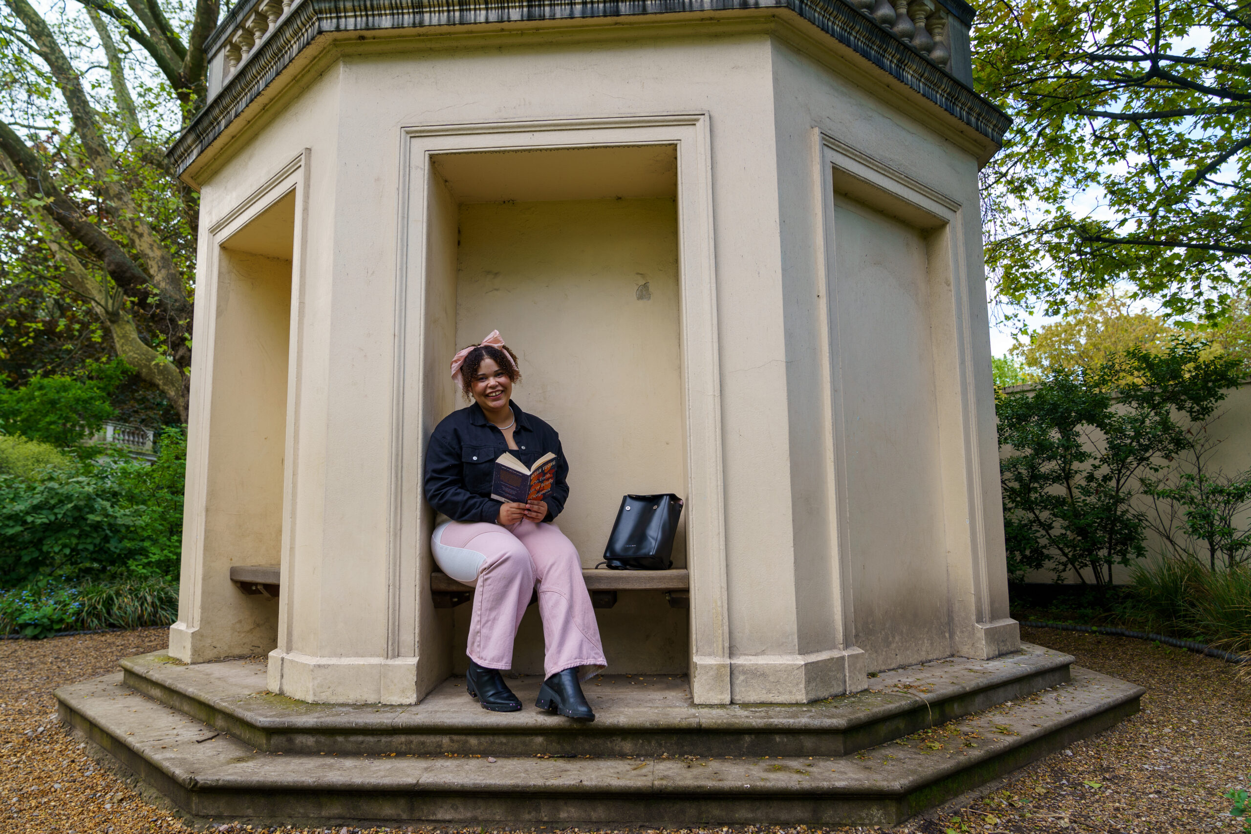 A girl sitting down with a book in her hand